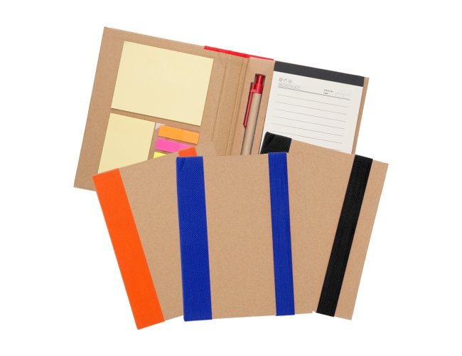 Bloco de anotações ecológico com caneta e autoadesivos, material kraft. Possui uma faixa colorida em tnt e fita elástica, parte interna com suporte para caneta de papelão com clip plástico; bloco amarelo médio com aproximadamente 20 folhas; bloco amarelo pequeno com aproximadamente 20 folhas; cinco blocos autoadesivos coloridos com aproximadamente 20 folhas cada e bloco de folhas pardas com aproximadamente 70 folhas.