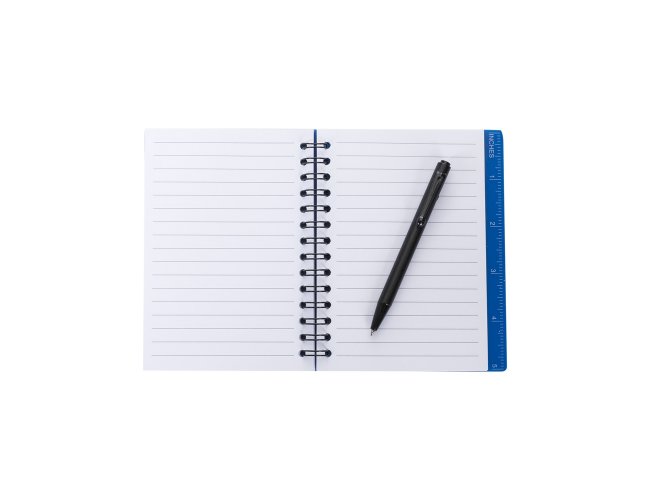 Bloco de anotações com mini caneta e régua. Bloco com wire-o, capa com suporte de nylon para a caneta e régua lateral com medição em escala de polegadas. Mini caneta plástica com carga esferográfica na cor azul e acionamento por clique. OBS.: PEDIDO APENAS MÚLTIPLO DE 100 PEÇAS!