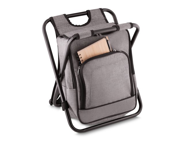 Bolsa térmica 10 litros com conversão em cadeira. Bolsa confeccionada em nylon, possui compartimento principal térmico e um bolso frontal. Armação de ferro na cor preta, alça superior da mochila costurada junto à armação, alças ajustáveis para as costas e velcros laterais para prender a armação e não abri-la enquanto estiver em movimento.