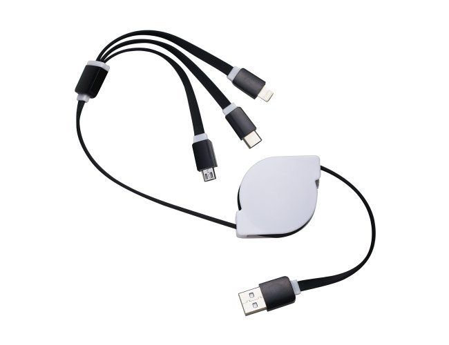 Cabo USB retrátil com as entradas Lightning/iPhone, V8/Android e Tipo-C/Android. Suporte com rolamento e trava automática. Suporte com frente lisa e parte traseira com área para aplicação de adesivo ou etiqueta resinada.
