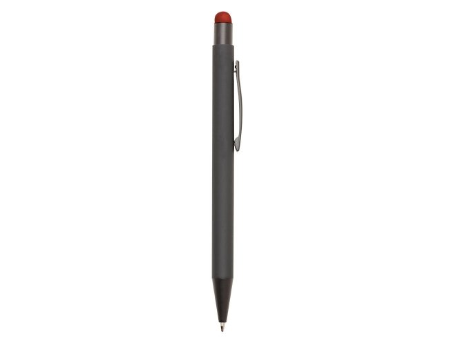 Caneta metal com ponteira touch colorida e pintura em preto fosco. Quando personalizada, a gravação possuirá a mesma cor da borracha touch. OBS.: A cor preta deverá ter a personalização amarelo/dourado. Aciona por clique.