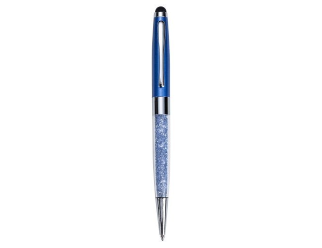 Caneta metal touch, parte inferior em plástico transparente com cristais(swarovski) interno. Clip metal e ponteira touch superior, cristal da mesma cor que o detalhe colorido da parte inferior. Aciona por giro. OBS.: PEDIDO APENAS MÚLTIPLO DE 50 PEÇAS!