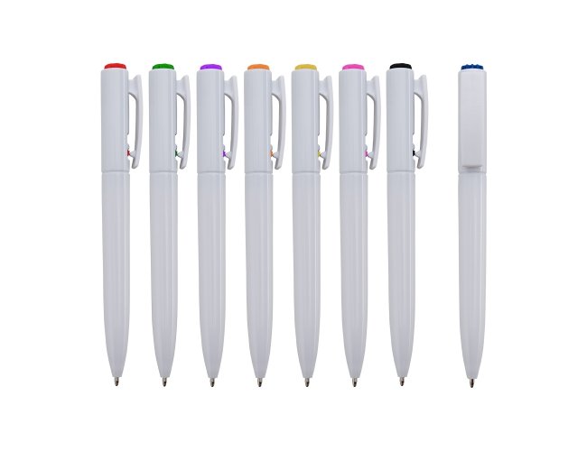 Caneta plástica branca com detalhes coloridos e anel central em relevo. Aciona por clique e para destravar basta apertar a parte inferior do clip.