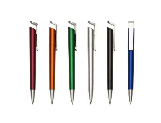 Caneta plástica colorida com detalhes prata. Clip plástico prata com detalhe vazado. Aciona por clique.