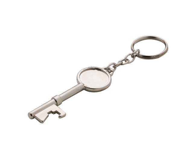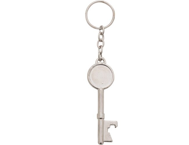 Chaveiro abridor metal em formato chave, frente e verso liso.