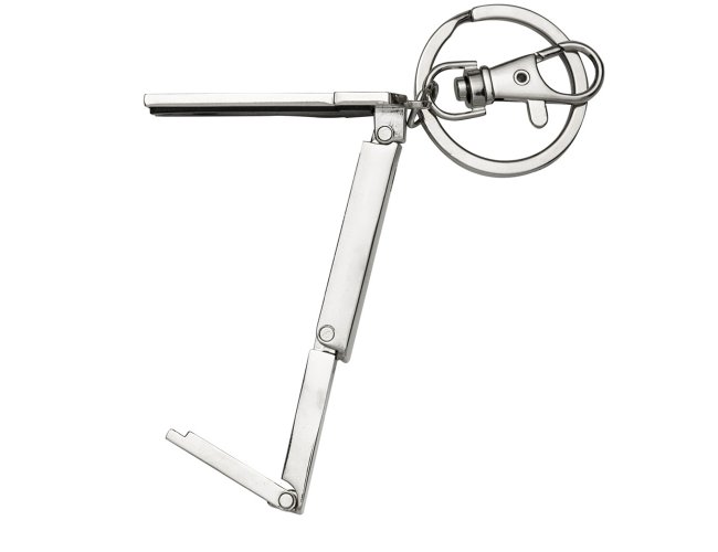 Chaveiro metal porta bolsa dobrável formato uniforme. Parte traseira com borracha anti deslizante, possui além do chaveiro um gancho prendedor. Para utilizar o porta bolsa basta puxar o compartimento traseiro(é imantado) e abri-lo.