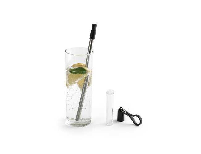 Conjunto de canudo. Aço inoxidável. 1 canudo telescópico, 1 escova de limpeza e estojo com mosquestão. Food grade. Canudo: ø9 x 218 mm