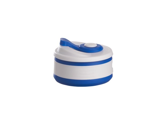 Copo retrátil 350ml de silicone, livre de BPA. Tampa plástica de encaixe com abertura para o bocal, acompanha "luva" plástica branca, evitando queimar as mãos com líquido quente.