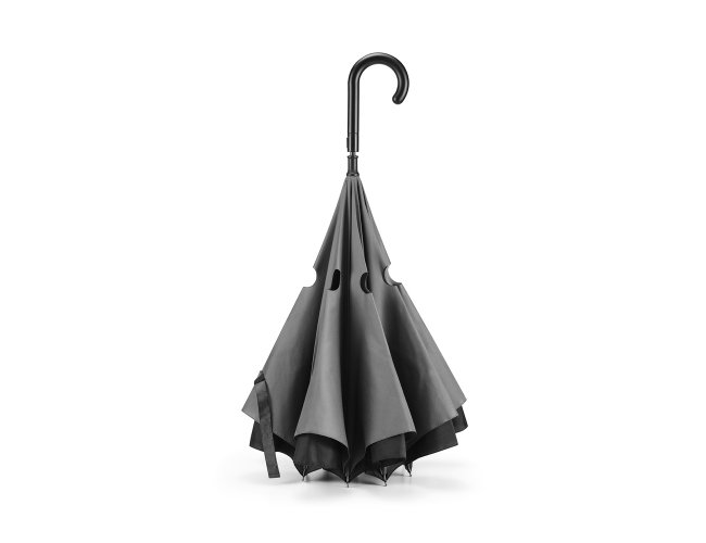 Guarda-chuva reversível. Pongee 190T. Capa dupla. Cabo em metal e varetas em fibra de vidro. Abertura manual e fecho automático. Estrutura patenteada. ø1050 mm