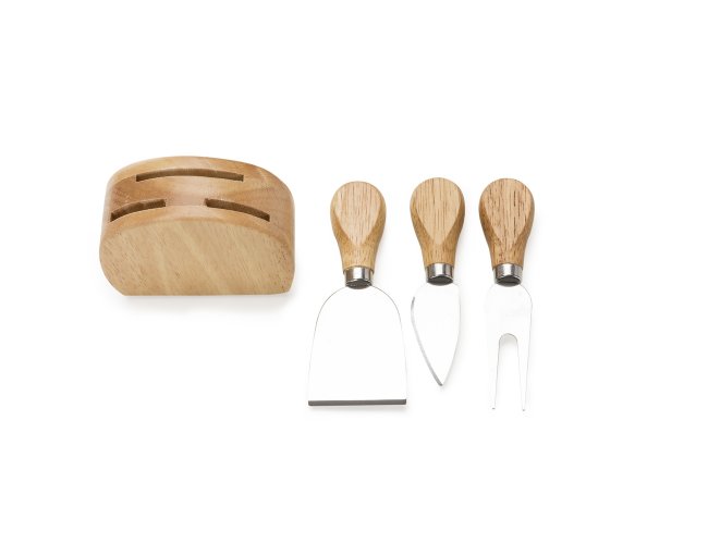Kit queijo com três peças e base de madeira. Possui: espátula, faca e garfo. Base de madeira com borrachas anti deslizantes na parte inferior.