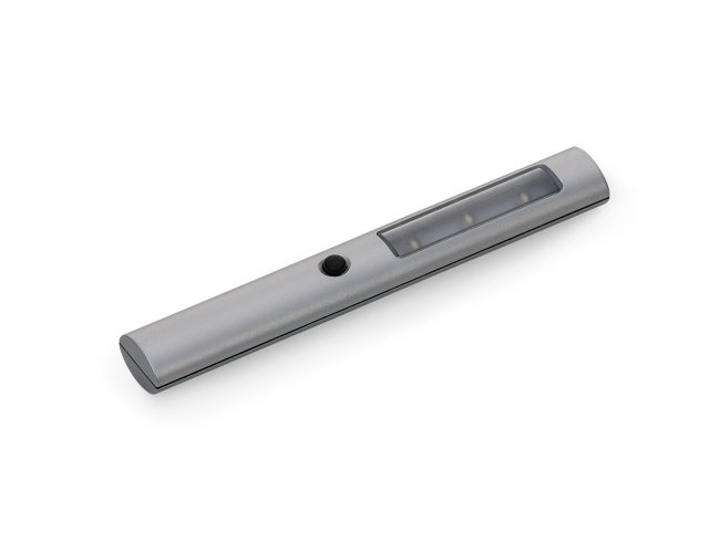 Lanterna bastão com 3 leds. Material plástico prata, possui dois imãs na parte traseira, parte frontal com um botão preto para ligar/desligar lanterna. Apertar uma vez aciona luz de emergência, apertando duas vez aciona lanterna, para desligar basta apertar o botão outra vez. Acompanha 4 baterias LR41. OBS.: PEDIDO APENAS MÚLTIPLO DE 50 PEÇAS!