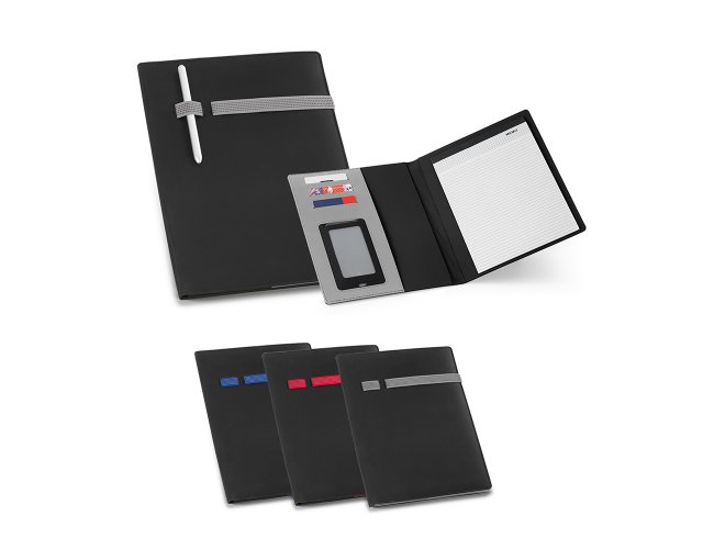 Pasta A4. Microfibra e 210D. Bloco: 20 folhas pautadas. Com porta esferográfica. Esferográfica não inclusa. 240 x 315 x 15 mm
