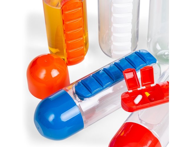 Squeeze 700ml plástico com porta comprimido. Garrafa transparente com encaixe para bandeja de comprimidos colorida, especificado por siglas referente os dias da semana, possui quatro ?pézinhos? no qual auxiliam o squeeze a fica na posição horizontal. Tampa rosqueável colorida.
