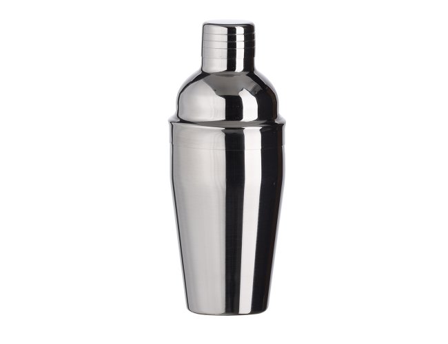 Coqueteleira com capacidade de 550ml, contém tampa de pressão com peneira e tampa protetora.