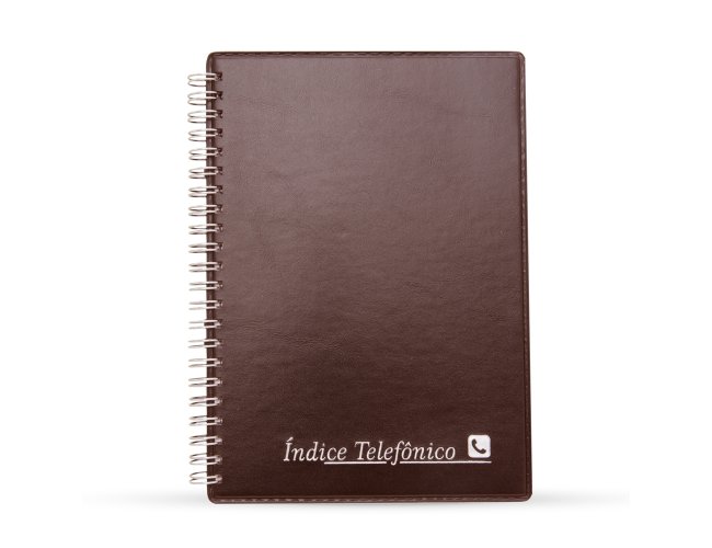 Caderneta índice telefônico de couro sintético. Possui página com dados pessoais, 2 folhas para anotações e índice de A à Z.
