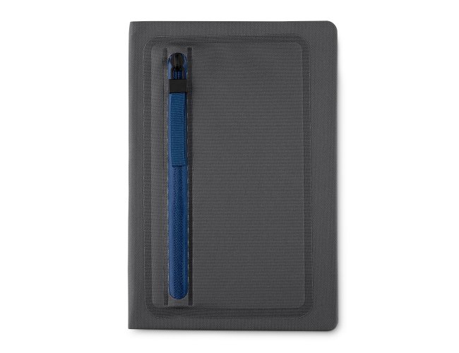 Caderno confeccionado em tecido sintético com carregador por indução, contém aproximadamente 80 folhas pardas pautadas. Possui entrada V8 e acompanha cabo USB, o carregador funciona apenas enquanto conectado à uma fonte de energia, o produto não armazena carga. O carregamento por indução só é compatível com celulares que possuam tecnologia QI.
