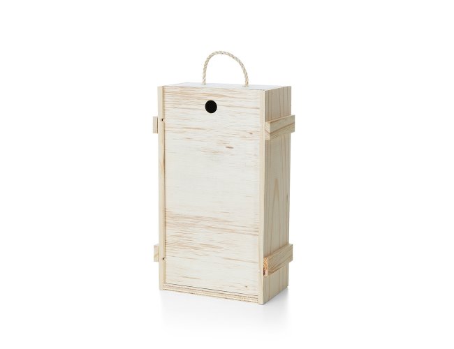 Estojo porta vinho para duas garrafas. Contém tampa frontal, alça de sisal para transporte e área interna com duas placas para fixação das garrafas.