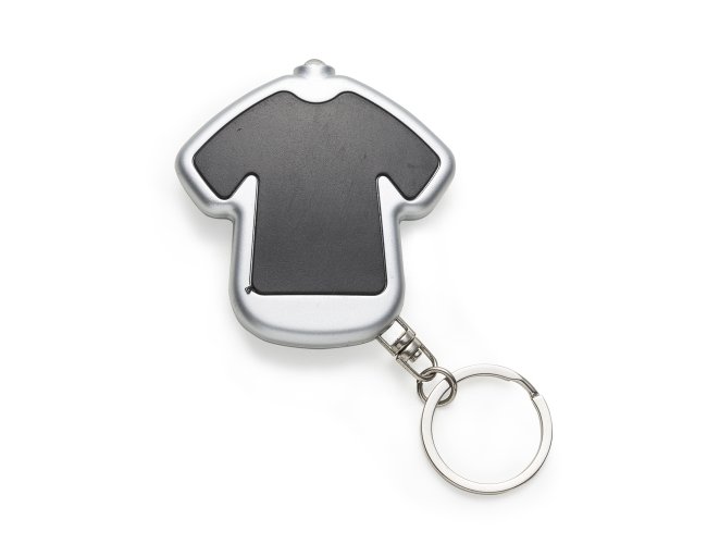 Chaveiro lanterna plástico formato camiseta colorida com contorno prata. Frente lisa e verso com parafusos e botão para
