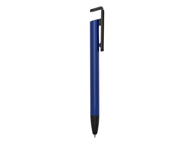 Caneta metal multifunções. Corpo colorido e detalhes preto, possui clip com limpador de teclado e parte superior vazada para ser utilizada como suporte para celular. Parte inferior com borracha touch, aciona por clique.